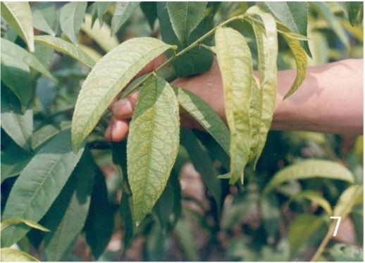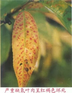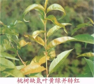 (1)桃树缺氮症状 土壤缺氮会使全株叶片变浅绿色至黄色。起初成熟的叶或近乎成熟的叶从浓绿色变为黄绿色,黄的程度逐渐加深,叶柄和叶脉则变红。新梢生长受阻,叶面积减少,枝条和叶片相对变硬。