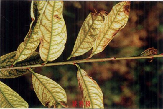 桃树缺镁,脉间均匀黄化,叶脉绿色,易在果实着生部叶片发生
