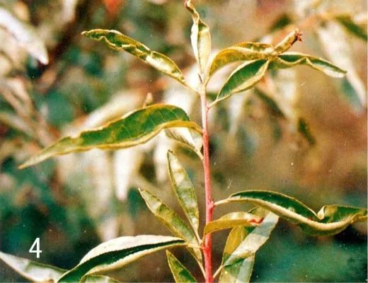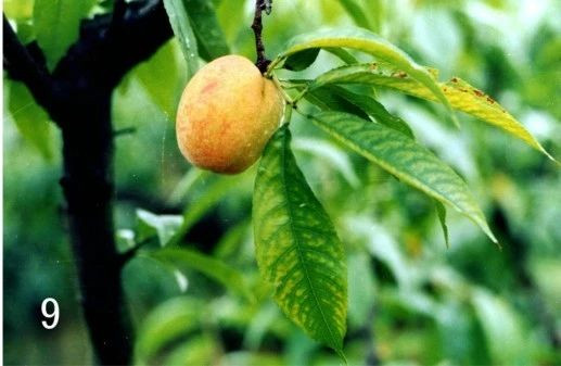 (6)桃树缺铁症状 缺铁症主要表现在新梢的幼嫩叶片上。开始叶肉先变黄,而叶脉两侧仍保持绿色,致使叶面呈绿色网纹状失绿。随病势发展,叶片失绿程度加重,出现整叶变为白色,叶缘枯焦,引起落叶。严重缺铁时,新梢顶端枯死。病树所结的果实仍为绿色。