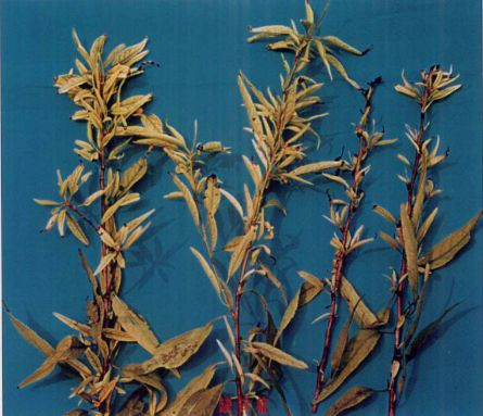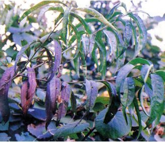 (4)桃树缺磷症状 初期全株叶片呈深绿色,常被误认为施氮过多,若此时温度较低,可见叶柄或叶背的叶脉呈红褐色或紫色,随后叶片正面呈红褐色。