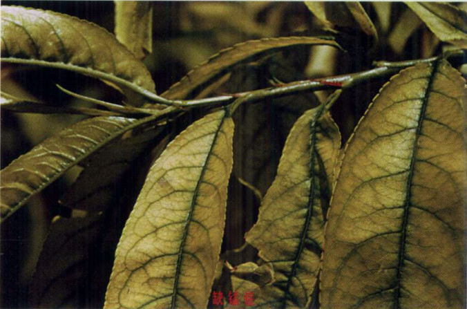 (5)桃树缺锰症状 主脉和中脉邻近组织绿色,叶脉间和叶缘组织褪绿。叶片长大前一般不会出现褪绿。随着生长,老叶色泽变得更深。只在极为严重的情况下新梢生长才矮化,叶片才呈现坏死斑点和穿孔。