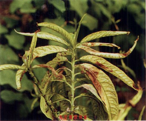 桃子缺铁严重时,新叶白化,且有枯死斑
